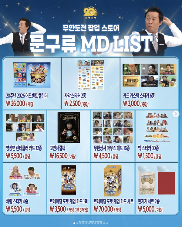 총 50여 종 굿즈가 준비됐는데, 무한도전 20주년 로고 티셔츠나 랜덤박스(포토카드+스티커)가 베스트셀러예요. 가격은 5,000원부터 시작해 부담 없고, 퀄리티는 공식 라이선스답게 탄탄! 구매 후 포장도 예쁘게 해주시고, 랜덤 특전(포토카드)이 따라와서 더 신날 거예요.
